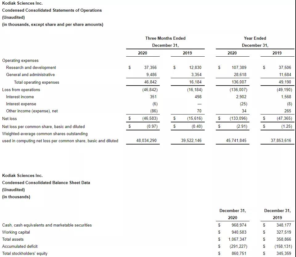 2021年3月1日,Kodiak Sciences Inc. 公布2020年全年财务状况,截至2020年12月31日,公司的现金、现金等价物和有价证券共9.69亿美元,去年同期为3.48亿美元。主要是由于公司于2020年11月发行股票获得6.12亿美元净收入;研发支出为1.074亿美元,去年同期为3750万美元,主要是由于临床试验费用增加、工资和基于股票的薪酬支出增加以及制造活动增加;一般及行政开支为2860万美元,去年同期为1170万美元,主要是由于工资和基于股票的薪酬支出增加;2020全年净亏损1.331亿美元,去年同期为4740万美元;基本和摊薄后每股净亏损2.91美元,去年同期为1.25美元。