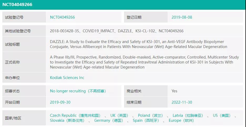 针对视网膜静脉阻塞(RVO),该公司开展了一项名为BEACON的前瞻性、多中心、随机、双盲3期临床试验(NCT04592419),旨在比较两个月负荷剂量后每两个月及以上注射一次KSI-301与每月注射一次Aflibercept(阿柏西普)治疗RVO的安全性与疗效。预计主要终点完成时间为2022年4月。中国3期临床正在火热开展中。