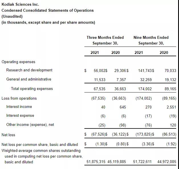 2021年11月9日,Kodiak Sciences Inc. 公布2021年第三季度财务状况,截至2021年9月30日,公司的现金、现金等价物共7.992亿美元,相比于2020年底减少了1.7亿美元;2021年前三季度研发支出为1.417亿美元,去年同期为7003万美元,增加的主要原因是KSI-301临床研究费用增加,工资和基于股票的薪酬支出增加;一般及行政开支为3226万美元,去年同期为1913万美元,也是由于工资和基于股票的薪酬支出增加;公司2021年前三季度净亏损1.738亿美元,去年同期为8651万美元;基本和摊薄后每股净亏损3.36美元,去年同期为1.92美元。