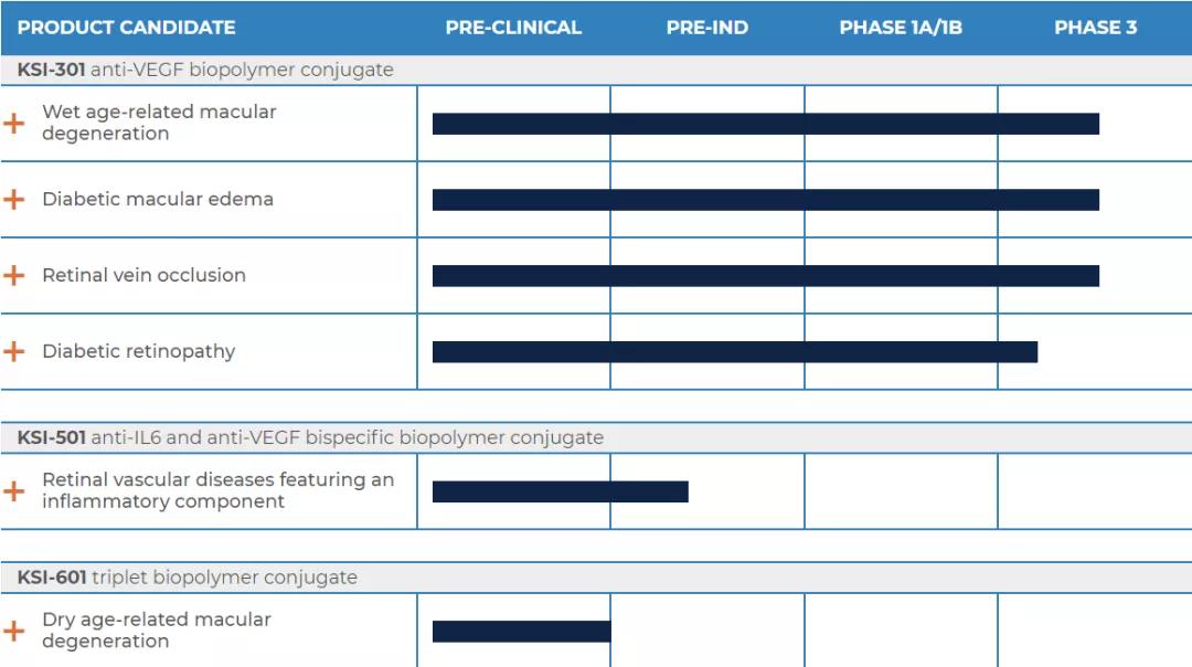 KSI-501是一款靶向IL-6 / VEGF的抗体-生物聚合物偶联物(ABC),由靶向IL-6 / VEGF的抗体融合蛋白(Trap-Antibody-Fusion, TAF)与磷脂酰胆碱生物聚合物相偶联,旨在抑制视网膜血管性疾病中异常的血管形成以及并发的炎症。临床前结构与功能研究表明,该TAF蛋白部分可同时特异性地与IL-6 / VEGF靶点相结合,该药或将为视网膜血管性疾病患者提供更加优越的治疗选择,尤其是那些具有高炎症水平的患者,如DME,以及眼部炎症性疾病,如葡萄膜炎。公司预计将于2022年上半年提交该药物的IND申请。