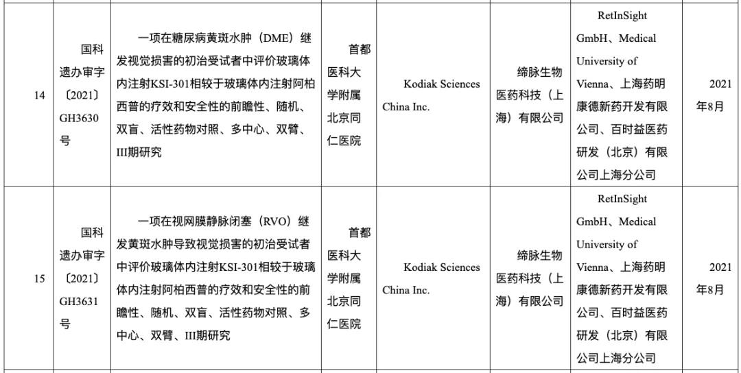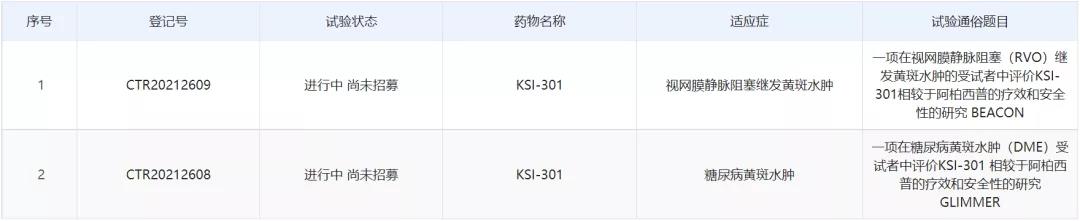 2021年3月,KSI-301注射液在国内的IND申请获NMPA批准,适应症为视网膜静脉阻塞继发黄斑水肿、糖尿病黄斑水肿。该项批准允许KSI-301的3期BEACON试验以及3期GLIMMER试验在中国招募患者,这将有助于该药物未来在中国获批上市。