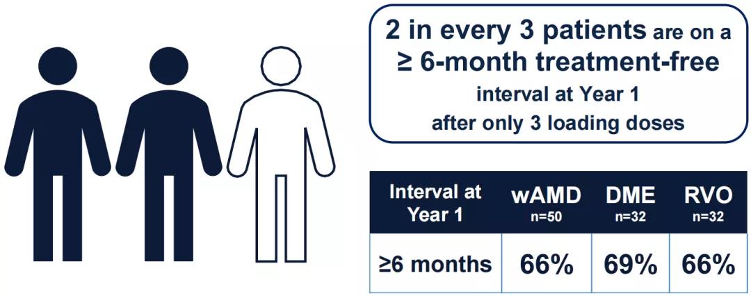 针对湿性年龄相关性黄斑变性(wAMD),在三次负荷剂量后,80%的患者在一年内再次给药不超过2次,54%的患者只需1次再次给药,80%的患者在随访期间至少实现了一次6个月的无治疗间隔。根据ETDRS视力表评估,患者最佳矫正视力较基线平均改善5.7个字母,达到69.7个ETDRS视力表字母(~20/40 Snellen)。
