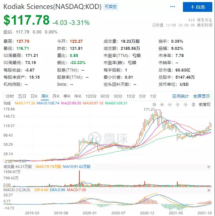 随着人类社会老龄化程度提高以及人们健康意识不断加强,全球眼科药物市场显示出巨大的潜力。亚太、拉美等地区作为眼科药物新兴市场,未来市场容量有望保持快速增长。同时AMD等老年眼科疾病发病率增加,以及眼科用药细分化,将推动全球眼科药物市场进一步扩容。据统计,2020年全球VEGF抑制剂销售额达到了115亿美元,其中相当大一部分与wAMD、DME和RVO这类视网膜病变的治疗有关。KSI-301若能成功实现商业化,Kodiak Sciences将在这百亿“赛道”中成为一家极具特色与实力的企业。依托公司历经十年打磨的ABC技术平台,兼顾生物相容性、患者顺应性、安全性与疗效,KSI-301将VEGF抑制剂的给药间隔再提高一个台阶,或将挑战当前视网膜血管性疾病的一线治疗方案,成为重磅炸弹药物。手握独创性技术和极具潜力的候选产品,截至2021年11月9日,Kodiak Sciences股价与2018年IPO时相比,已上涨约12倍。目前市值约51.66亿美元(截止2021年11月24日收盘)。