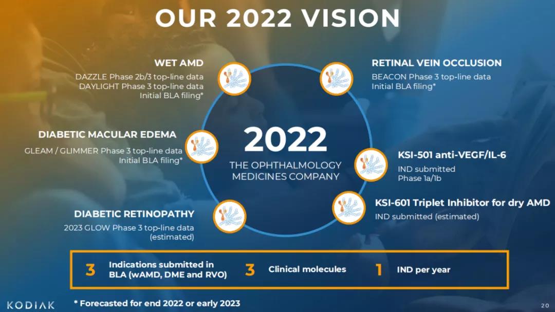 为了构建领先的视网膜药物管线,Kodiak Sciences制定了2022年愿景。基于2b/3期DAZZLE试验、3期DAYLIGHT试验、3期GLEAM / GLIMMER试验、3期BEACON试验的顶线数据,预计公司将于2022年底或2023年初提交KSI-301的BLA申请,适应症包含wAMD、DME以及RVO。