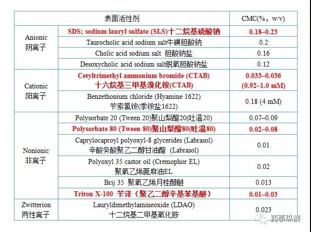 如果上述条件都不合适,可以考虑采用加入表面活性剂,此时应查询国内外文献、专利、质量标准,并结合药物结构选择表面活性剂的种类。筛选时,应根据情况考虑涵盖所有常用种类的表面活性剂,比如阴离子型、阳离子型、和非离子型。USP<1092>中列举了多种商品化的表面活性剂及其临界胶束浓度(Critical Micelle Concentration,CMC)的近似临界值,在方法开发中可以参考。