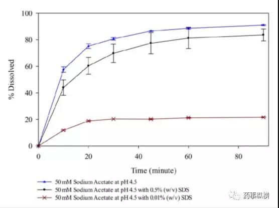 研究中发现,在含有低于CMC浓度的SDS的pH4.5介质中形成了不溶性盐,影响了药物的溶解度和制剂的润湿性,而在高pH时这种现象不明显。pH4.5介质中,当SDS浓度高于CMC浓度时,其溶出也比不加SDS的情况慢。
