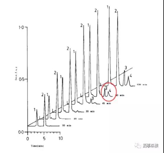 利福平在酸溶液中的降解情况(3、4为两个降解物峰)