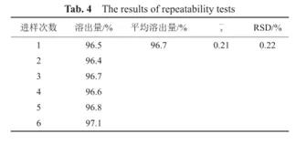 重复性即在同样的操作条件下,在较短时间间隔内,由同一分析人员测定所得结果的精密度。可在规定浓度范围内,取同一浓度(分析方法拟定的样品测定浓度,相当于100%浓度水平)的供试品,用至少6份样品溶液的测定结果进行评价;或设计至少三种不同浓度,每种浓度分别制备至少三份供试品溶液进行测定,用至少9份样品的测定结果进行评价(浓度设定应考虑样品的浓度范围)。实际实验操作中,可能有几种方法,方法一:取6个单独制剂分别测定溶出度,计算RSD,但该方法测定时受制剂个体差异影响比较大,如果测定结果重复性不好,可能是因为制剂含量差异所导致,用该方法时最好是挑选质量较好,例如含量均匀度较好的片剂进行实验;方法二即取供试品1片(粒),置于一个溶出杯中,按照溶出度方法测定,至规定取样点时去处六份供试液分别测定溶出度计算RSD值。结果接受标准为RSD不超过2.0%。例如取头孢克肟颗粒6袋,按照溶出度方法进行溶出,30min取溶出液滤过,进样计算溶出度,结果表明该溶出测定方法重复性良好。