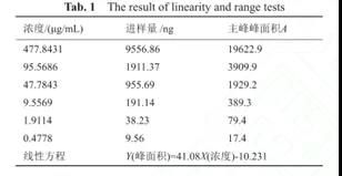 例如取头孢克肟对照品55.37mg,置100ml容量瓶中配置为储备液,然后就依次精密移取稀释成一系列梯度浓度,以浓度为纵坐标,相应峰面积为横坐标进行线性回归,结果表明头孢克肟浓度在0.48-477.84μg/ml范围内,进样量在9.34-9337.66ng范围内,进样量与峰面积呈良好线性关系。