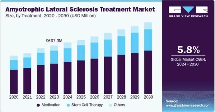 在商业价值方面,目前获批的ALS新药托夫生(Tofersen,QALSODY)已取得一定的销售成绩,2024年全球销售额达3200万美元。专业人士预计AMX0114峰值年销售额可达1.5亿美元。2023年,全球ALS治疗市场规模为6.673亿美元,预计2024 - 2030年将以5.8%的复合年增长率增长,其中药物治疗占比63.1%,干细胞治疗也在快速发展。
