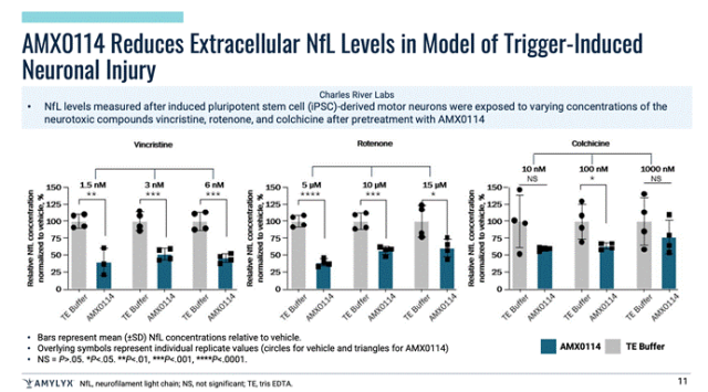目前,AMX0114正在加拿大进行ALS(肌萎缩侧索硬化症)的1期临床试验(NCT06665165)。在多项研究中,AMX0114展现出了良好的治疗潜力。在诱导多能干细胞衍生的运动神经元模型中,预处理AMX0114后,再暴露于神经毒性化合物,结果显示它能显著降低细胞外神经丝轻链(NfL)水平,而NfL是中枢神经系统疾病中轴突损伤的生物标志物,这意味着AMX0114在减轻神经损伤方面效果显著。