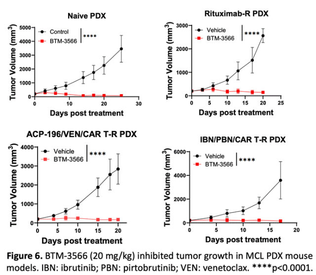 在套细胞淋巴瘤方面,BTM-3566能抑制细胞增殖并诱导凋亡,且不受伊布替尼和维奈克拉耐药状态的影响。在不同的动物模型中,BTM-3566也展现出强大的实力,在CDX和多种耐药的PDX小鼠模型中,几乎能完全抑制肿瘤生长。