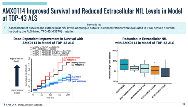 在携带ALS相关TDP-43(M337V)突变的诱导多能干细胞衍生神经元模型中,AMX0114不仅改善了神经元的生存率,还降低了细胞外NfL水平。