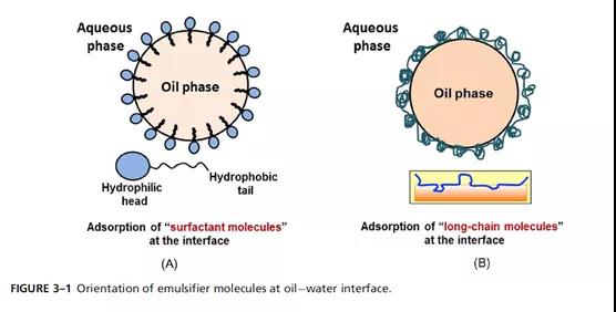 表面活性剂分子具有亲水头和疏水尾基团,以水相的头基团和油相的尾基团吸附在油界面上稳定乳液。如图3-1A所示,亲水部分与水相对齐,亲脂部分与油相对齐。该表面活性剂可分为离子型、两性离子型和非离子型。在离子表面活性剂中,亲水头要么带正电(阳离子表面活性剂),要么带负电(阴离子表面活性剂),并通过与油滴的静电作用来稳定乳液。另一方面,非离子表面活性剂不带电荷,通常主要通过空间位阻作用来稳定乳液。通常,亲油乳化剂的亲水亲油平衡值HLB值<7,它可以稳定油包水乳液;亲水乳化剂的HLB值>7,它可以稳定水包油乳液。