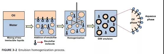 如前所述,乳液稳定有两种方式,一是使用合适的乳化剂,二是在均质器中均质混合物,为液滴的分裂及其在连续相中的分散提供剪切力。乳化剂的作用是吸附在油/水界面,增大界面面积,从而减小乳液中油相的液滴大小。而均质是使乳液的所有成分(乳化剂、油和水)均匀分布,以使液滴在连续相中破碎和分散。因此,乳液的稳定性取决于合适的乳化剂和均质器。