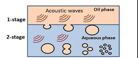 与高能均质技术(如高压均质机和微流化器)相比,超声波提供了更高的混合强度来制备乳液。空腔的内爆坍塌在微观层面上耗散能量,从而引发液滴的破坏过程。详细的机理见图3-4。第一阶段为原生液滴的产生阶段,声场产生界面波,界面波的不稳定性导致油相以液滴的形式喷发入水中。第二阶段是初生油滴破碎阶段,气泡剧烈不对称内爆,形成微射流,有效地破碎初生油滴。液滴的破碎主要由施加于液滴的剪切类型和剪切量所控制。此外,液滴的稳定性取决于表面活性剂吸附在新形成液滴界面上的速率,并受表面活性剂的表面活性和浓度控制。因此,选择合适的表面活性剂对制备高稳定的纳米乳至关重要。