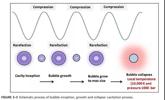在超声技术中,声波通过液体介质而产生空腔。声谱范围为16 kHz,可分为三个主要部分:低频大功率超声(20100 kHz)、高频中功率超声(100 kHz至1 MHz)和高频低功率超声(110 MHz)。超声波包括稀薄循环(膨胀循环)和压缩循环,当这些波通过液体传播时,形成气泡/空腔,然后在等温膨胀条件下迅速生长,最后形成空腔的绝热坍缩,如图3-3。稀化循环中液体分子间的平均距离较大,压缩循环中液体分子间的平均距离较小。空化发生在稀薄循环中,当负声压足够大,使液体分子彼此分开,并且相邻分子之间的距离可以超过临界分子距离。这时,液体中就会产生空隙,从而形成空腔。随后,在声波的压缩循环中,声压为正,将分子推到一起。在超声波的压缩循环中,空腔会被压缩(尺寸减小),其中很少有空腔会在最小的时间间隔内坍塌。最后的坍塌阶段是绝热的,因此产生了较高的局部温度和压力条件。