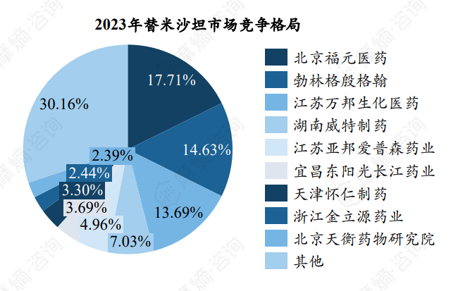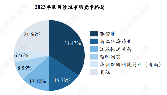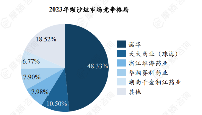 竞争格局方面,原研诺华占据最大市场份额,2023年市场份额为48.33%,仿制药企天大药业(珠海)、华海药业排名第二、第三位。