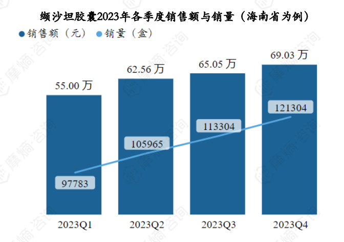 据摩熵医药药物流向数据显示,以海南省为例,缬沙坦胶囊2023年各季度销售量和销售额如下图: