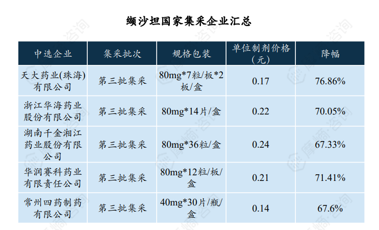 据摩熵医药药品集中采购数据库统计显示,缬沙坦于2020年纳入第三批国家集采,中选药品总计达12个,中选企业包括天大药业(珠海)、华海药业、湖南千金湘江药业等5家,平均降幅为71.50%。降幅最高的品种为天大药业(珠海)的缬沙坦胶囊,单位中选价格为0.17元/粒,降幅达76.86%。