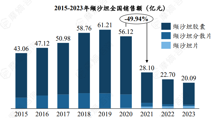 根据摩熵医药数据库统计显示,我国缬沙坦单方制剂产品2015-2019年销售额呈稳健增长趋势,2019年达到峰值61.21亿元,2020年入选第三批集采后,2021年销售额同比下降49.94%,2023年仅剩约20.09亿元。