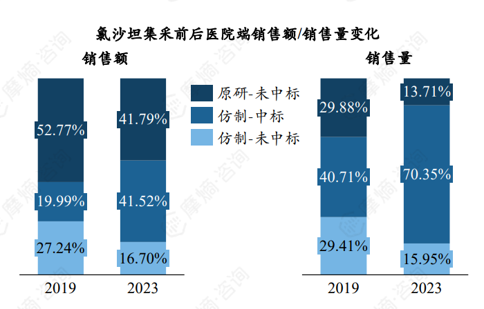 氯沙坦于2018、2019年纳入首批4+7集采,中选企业为浙江华海药业,降幅为66.44%,其中100mg*7片/板*2板品规降幅最高,为74.61%。原研企业默沙东未进集采,集采前后,默沙东医院端销售额占比从52.77%下降至41.79%,销售量占比从29.88%下滑至13.71%,中选企业华海药业医院端销售额提升21.53%,销售量提升29.64%,放量显著。