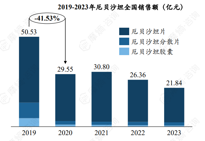 根据摩熵医药数据库统计显示,近五年厄贝沙坦全国销售额呈现下降趋势,影响因素主要为纳入首批集采,2019年厄贝沙坦全国销售额约50.53亿元,集采后2020年销售额同比下降41.53%,2023年仅为21.84亿元。