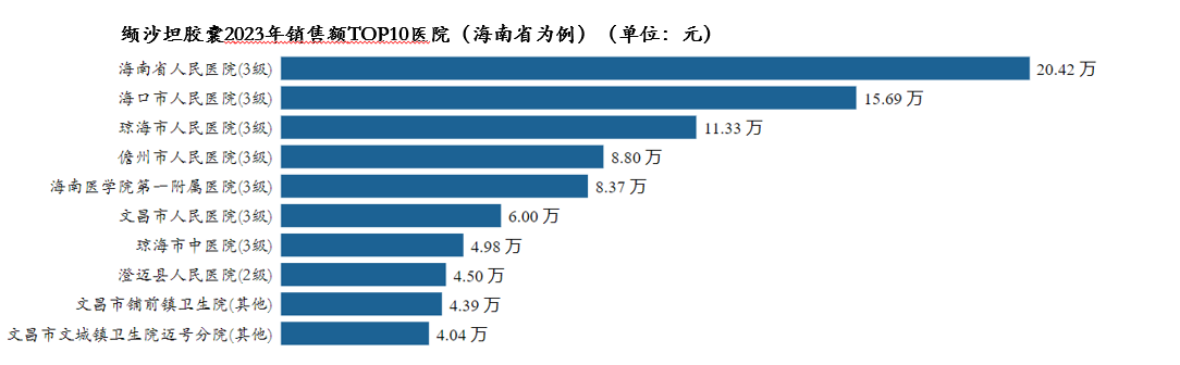 缬沙坦胶囊2023年销售额TOP3医院(海南省为例)分别为海南省人民医院、海口市人民医院、琼海市人民医院。