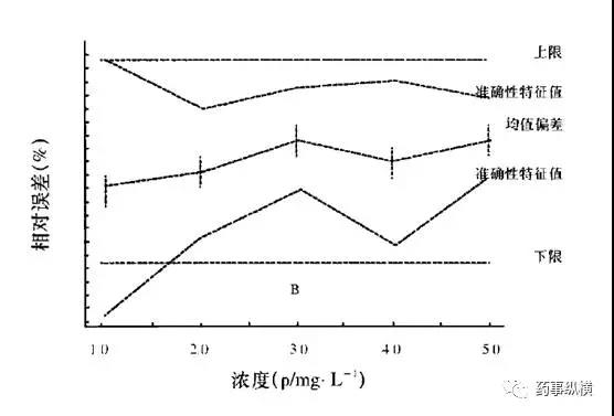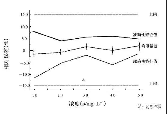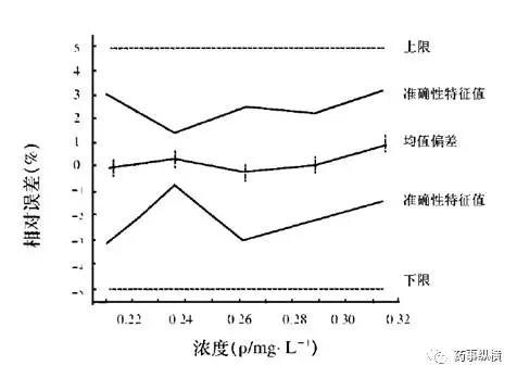 通过eNvoal引入了准确性特征值的概念,是整个浓度范围的预测模式, 涵盖了准确性、准确性、精密度和定量限。推断预测区间和风险评估, 也可提供一般统计数据(平均值、RSD等)。浓度范围的预测的准确性和特征值,见下图。