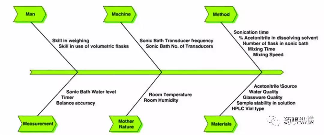 在测量这个环节,以HPLC为例,受到样品溶液、对照品溶液、仪器性能、检测器类型或能量、检测波长、检测器的参数设置、计算公式、线性范围、溶剂峰(或辅料峰)、试剂纯度、色谱柱、甚至样品小瓶等的影响,总之变量因素非常多,遇到异常问题时可以采用鱼骨图等方式进行分解研究,如下图。