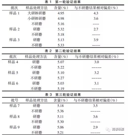 实验设计(方案)的多样性、对样品从取样到检测完毕这个过程的研究深度、是否对检测过程中的“异常”问题进行深入分析等,往往会对最终测定结果的准确性产生影响甚至会致使“超标”现象。例如:文章《辛伐他汀片的含量测定中研磨对含量结果的影响》报道,日常检验中发现辛伐他汀片同一批成品的含量与同批颗粒的含量偏低4%左右。从颗粒到压片的过程,从理论上讲不应该出现主药含量下降的情况,并且检验过程无误。由于在检验过程中颗粒和成品的区别只有研磨时间和难易程度不同,所以从研磨方面查找原因。结果表明,辛伐他汀片在含量测定过程中,取20片研磨称取细粉测定含量的结果与不研磨而是直接称取整片测定含量的结果比较相差较大。研究发现研磨程度和研钵大小都会有一定影响,所以应取用相同材质和同样大小的研钵,并且用力均一。研磨样品应都取20 片,防止样品的研磨量不同引起误差。5mg规格辛伐他汀片应直接称取4 片进行测定。部分代表性数据如下: