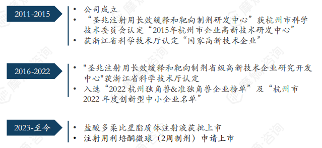 圣兆药物成立于2011年,立足长效缓释制剂和靶向制剂两大创新制剂领域,专注于以微球、微晶、脂质体和缓释植入剂为核心的高端复杂注射剂的开发和产业化。研发产品适应症涵盖精神分裂症、恶性肿瘤、子宫内膜异位症、术后镇痛以及糖尿病等重大疾病谱,公司研发的高端复杂注射剂产品能显著提高药物临床疗效,降低药物毒副作用和给药频率,大大提高患者用药依从性。其长效缓释制剂研究中心主要进行长效缓释微球制剂技术、非微球类长效缓释制剂技术(纳米或微米级准溶性药物长效缓释技术)的开发,拥有微球制剂反应系统等成套符合cGMP标准、满足长效缓释制剂工艺研究要求的进口高端定制设备。圣兆药物26个产品管线中,盐酸多柔比星脂质体注射液已于2023年9月获批上市,注射用利培酮微球(2周制剂)已处于上市审评阶段。