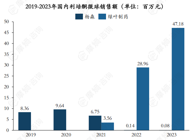 截至2024年10月,国内市场上销售利培酮微球的企业有杨森和绿叶制药,自绿叶制药的瑞欣妥推入市场后,销售额一路走高,2023年销售额达到4718万元,目前市场占比已超过99%。