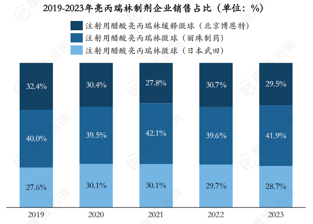 截至2024年10月,国内市场上销售亮丙瑞林制剂的企业有北京博恩特、丽珠制药和日本武田,2023年销售额占比分别为29.5%、41.9%和28.7%。近五年,丽珠制药的注射用醋酸亮丙瑞林微球的销售额占比最高,销售额占比基本维持在40%左右。