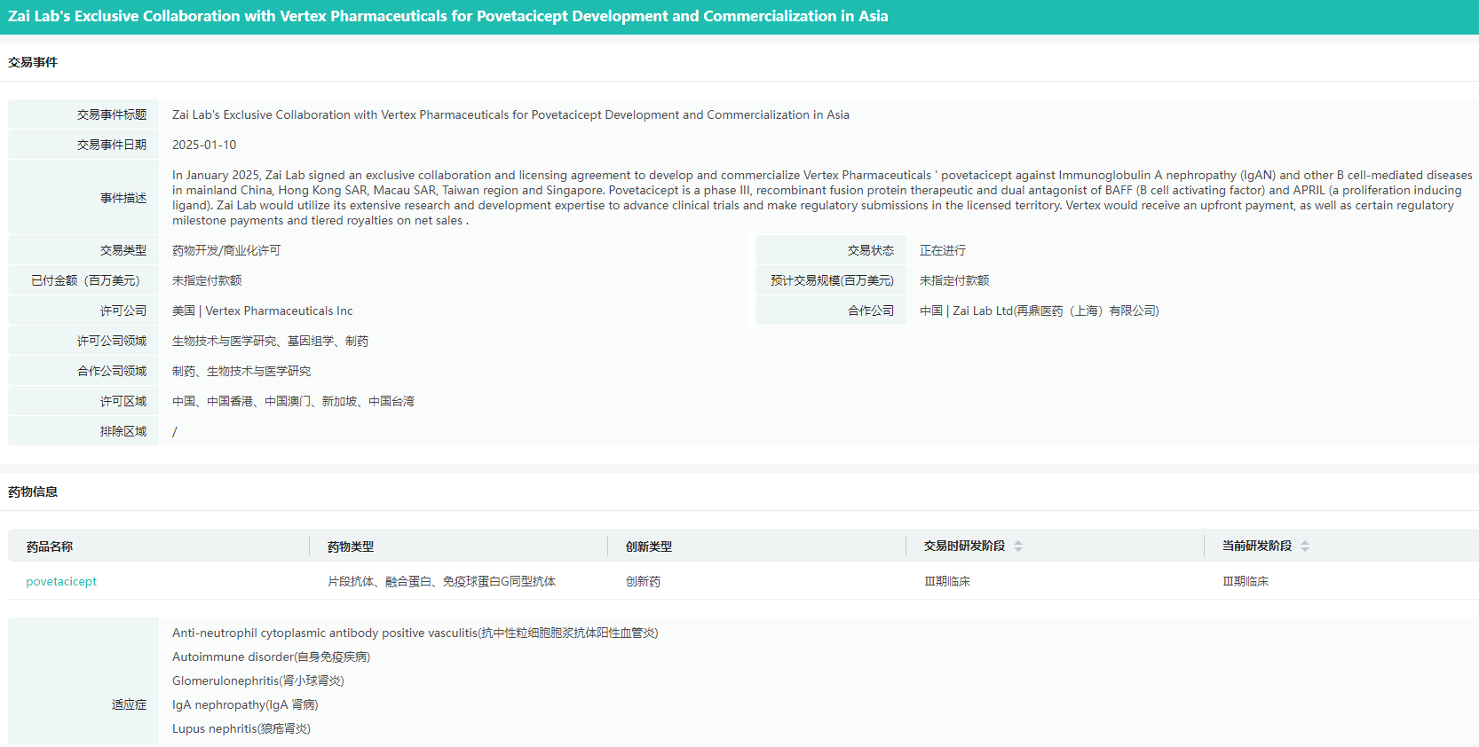 Povetacicept交易事件信息查询