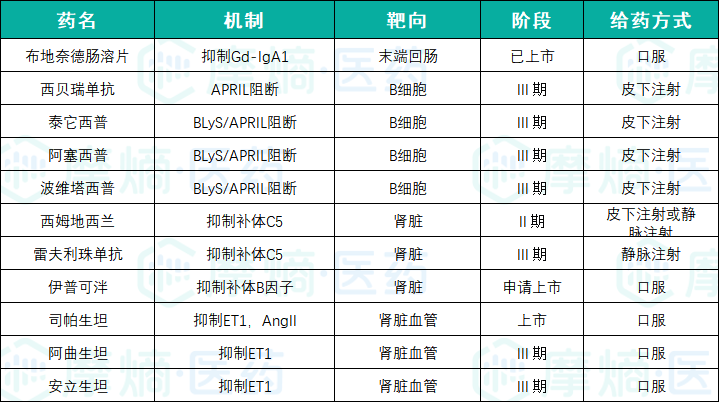 IgA肾病治疗不同靶向药物特点及研发进度