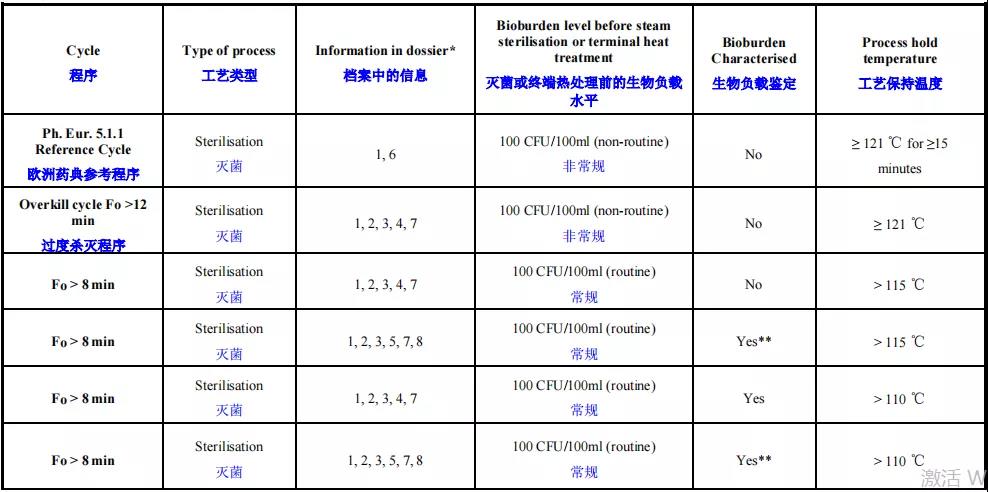 在这个表里,从第三行开始到最后都属于“基于产品特性的灭菌工艺”。不同的灭菌工艺,验证或者说申报时需要做的研究有很大的不同。灭菌温度越低,F0值越低,需要了解的内容(如菌种的鉴定,药液的微生物负载水平)就越多。为促使申请人主动提高无菌保证水平,EMA单独将F0>8列出来放在决策树中。与EMA指南相比,国内的指导原则分得就没有那么细了。F0<8的情形完全没有涉及。