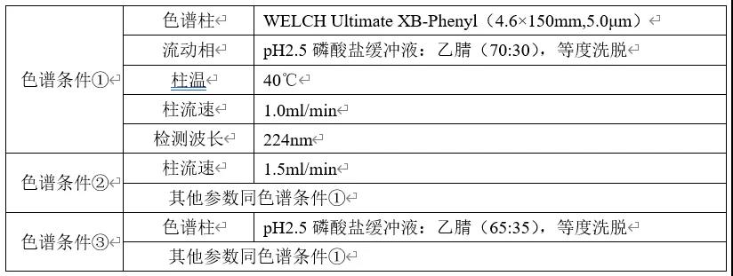 色谱条件 用苯基键合硅胶为填充剂[如WelchUltimate XB Phenyl柱(4.6×150mm,5.0μm)];以磷酸盐溶液[取无水磷酸二氢钾2.0g,加水1000ml使溶解,并用磷酸调节PH值至2.5±0.1]-乙腈(65:35)为流动相;流速为1.0ml/min,柱温为40℃,检测波长为224nm,进样体积10μl。