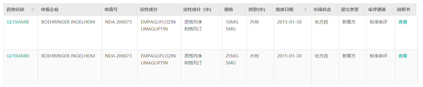 据药融云数据库显示,2015年1月30日,美国FDA批准新型复方降糖药物Glyxambi(恩格列净/利格列汀)的上市申请,用于2型糖尿病成年患者的辅助治疗。该药也是目前美国唯一的一款SGLT2抑制剂(恩格列净[empagliflozin],勃林格殷格翰)和DPP-4抑制剂(利格列汀[linagliptin],礼来)的复方药物。