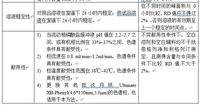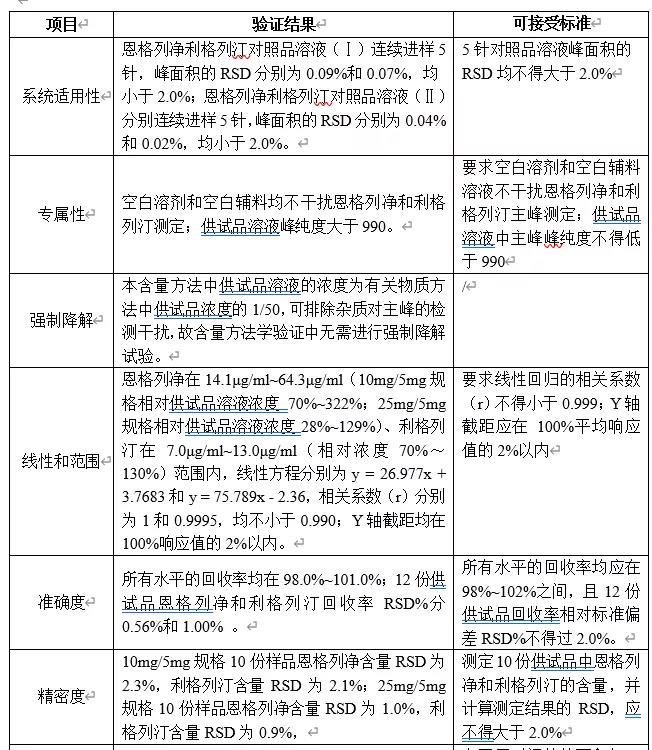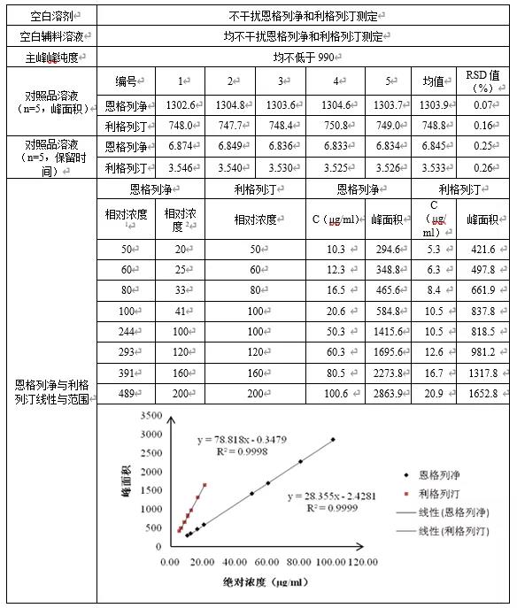 对暂定恩格列净利格列汀片含量检测方法的色谱条件进行简单验证(系统适用性、专属性和线性),结果见下表。