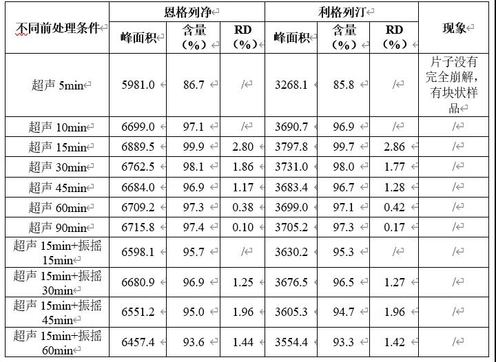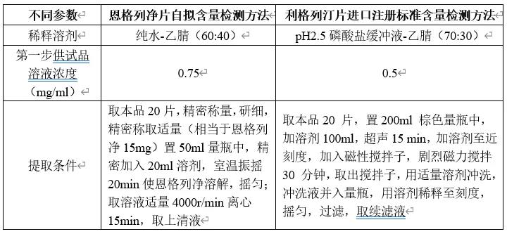 本品处方组成与单方制剂利格列汀片较为接近,推测其辅料干扰和提取难度较为接近;另对比恩格列净片自拟含量检测方法前处理条件和利格列汀片进口注册标准含量检测方法前处理参数如下。