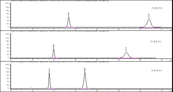 由以上色谱图可知,1)增加苯基柱可明显调整各主成分的保留时间,因①条件下两成分出峰时间较晚,故尝试通过增加柱流速或提高有机相比例的方式,缩短整体的分析时间;2)增加柱流速对于恩格列净色谱峰型和保留时间没有明显改善;3)色谱条件③下,利格列汀出峰时间为3.551min(对称因子0.83),恩格列净出峰时间调整为6.858min(对称因子1.11),出峰时间差△TR<3.5min;4)目前各成分峰高较为合适(均在100mAU,推测其恩格列净浓度为0.020mg/ml时响应峰高约为50mAU),故可暂定为恩格列净利格列汀片含量检测方法色谱条件。