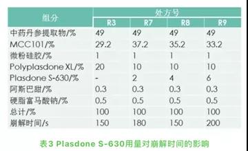 压片阶段:压力过大会造成片剂较实较硬,片剂孔隙较少,从而导致水分不易渗入片剂内部充分发挥润湿作用。所以在满足硬度要求的前提下,适当降低片剂压力,增加片剂的孔隙率。可以考虑选用一些适宜辅料,满足在较小压力下,达到目标硬度,可以使片剂内部结构更为疏松,水分更易渗入片芯而加快片剂的崩解。例如可选用适量的微晶纤维素MCC,可在一定程度增加孔隙率,同时它兼具促崩解作用,当然,具体选用型号和用量问题很重要,要基于不同的品种去筛选一个合适的型号和用量效果。又例如,有研究考察外加一定量的共聚维酮Plasdone S-630对分散片崩解时间的的影响,结果证实共聚维酮Plasdone S-630的加入,中药丹参分散片的可压性更好,片面更加光滑,这可能是其优异的干粘合效果导致的。但需要注意其用量问题,因其是水溶性聚合物,遇水容易发粘,用量过大反而对其分散片的均匀性和崩解带来负面影响。