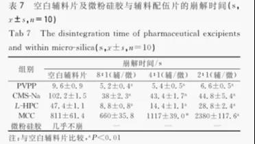 处方中可外加适量微粉硅胶,因微粉硅胶具有较大的比表面积和孔隙度,因此具备更为优越的吸水性,可以在片剂内部形成发达的微孔通道,有利于水分快速渗入片剂内部,加快片芯的润湿,从而缩短崩解时间。有文献研究表明:当微粉硅胶与三种崩解剂PVPP、CMS-Na、L-HPC配伍使用时均能缩短崩解时间,且在辅料与微粉硅胶8:1配伍使用时,崩解时间最短。说明微粉硅胶在一定剂量范围内可以促进崩解剂的崩解。