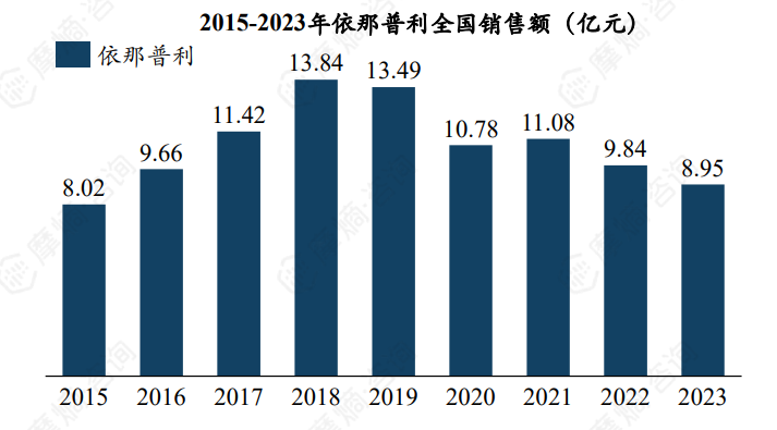 截止2024年10月,我国已上市的依那普利单方/复方制剂包括依那普利注射液、依那普利氢氯噻嗪片、以及马来酸依那普利片等7款产品。根据摩熵医药数据库统计,我国依那普利全国销售峰值为13.84亿元,自2018年起连续多年呈下降趋势,主要原因为集采降价,2023年销售额仅约8.95亿元。