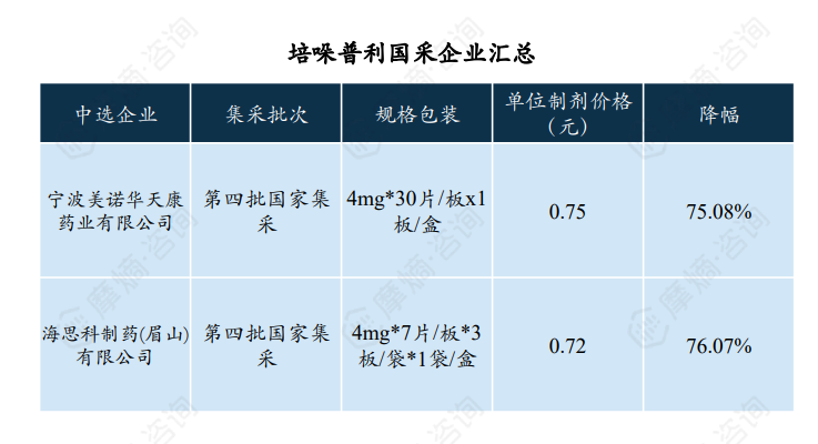 培哚普利于2021年进入第四批国家集采,中选企业有两家,