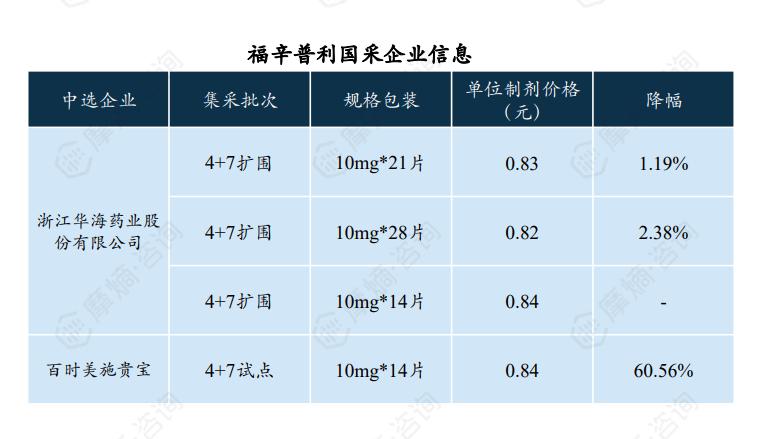福辛普利于2018年纳入首批“4+7”集采,原研企业百时美施贵宝及仿制药企华海药业均中标。