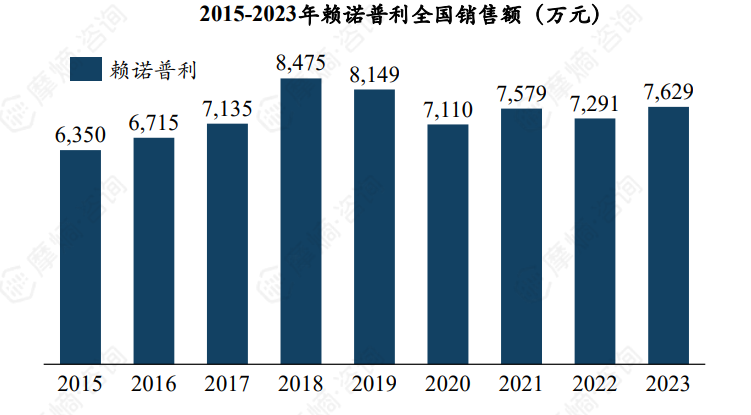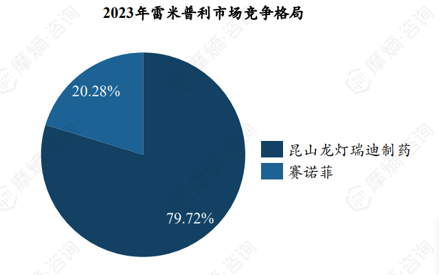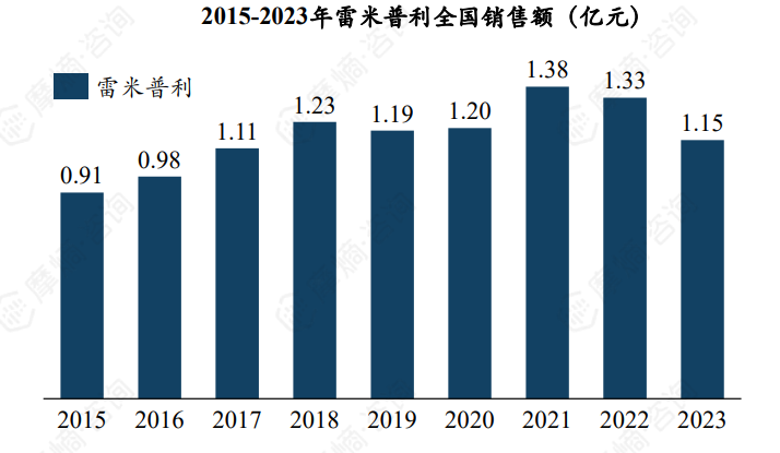 根据摩熵医药数据库显示,2015-2023雷米普利全国销售额整体维持在1亿元左右,2021年销售峰值约1.38亿元。目前我国市场上的雷米普利仅一款原研药、一款仿制药,形成了“1+1”竞争格局。2023年原研药企赛诺菲市场份额为20.28%,仿制药企昆山龙灯瑞迪制药份额约79.72%。