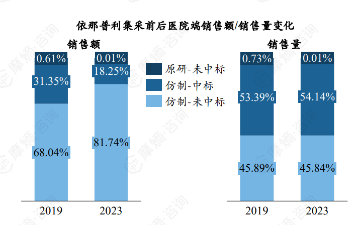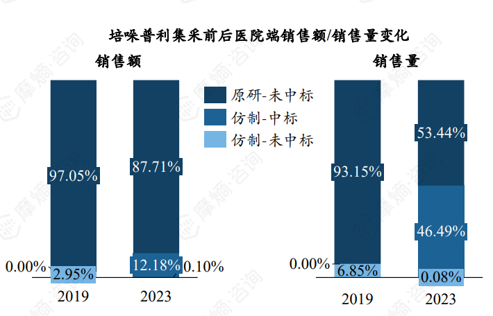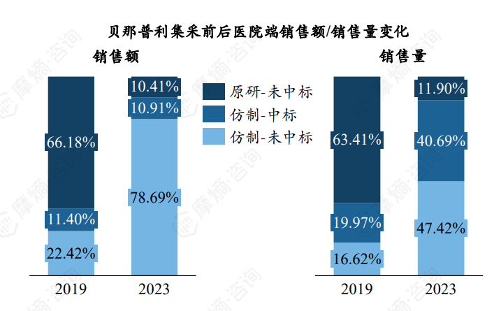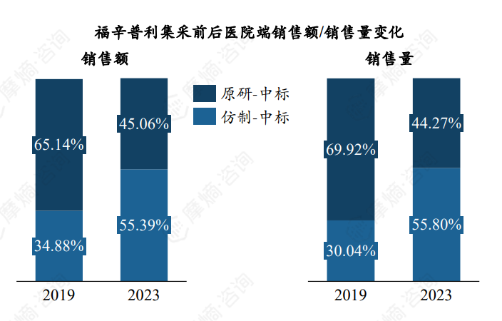 根据摩熵医药数据库统计显示,集采后,原研企业诺华医院端销售额占比从2019年的66.18%降至2023年的10.41%,销售量占比从2019年的63.41%降至2023年的11.90%,预计未来份额将进一步缩减,集采未中标企业份额提升明显。