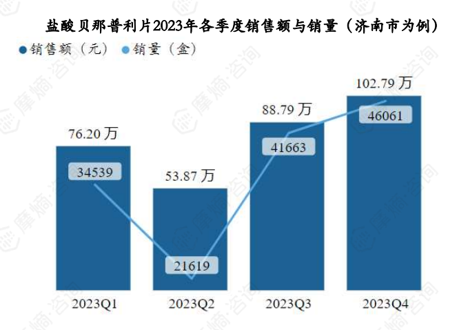 据摩熵医药药物流向数据显示,以济南市为例,盐酸贝那普利片2023年各季度销售量和销售额如下图;